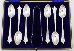 Six teaspoons with sugar tongs, Cooper Brothers, Sheffield 1940, 107mm, 91g. |