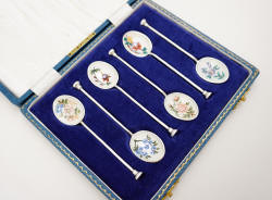 Six enamel decorated silver coffee spoons featuring hand painted English summer garden flowers, Birmingham 1968. |