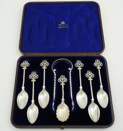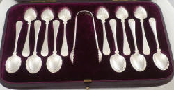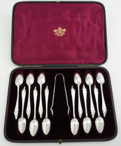 Twelve 4 ¼" + sugar tongs, Francis Higgins, London 1882, 195g. |