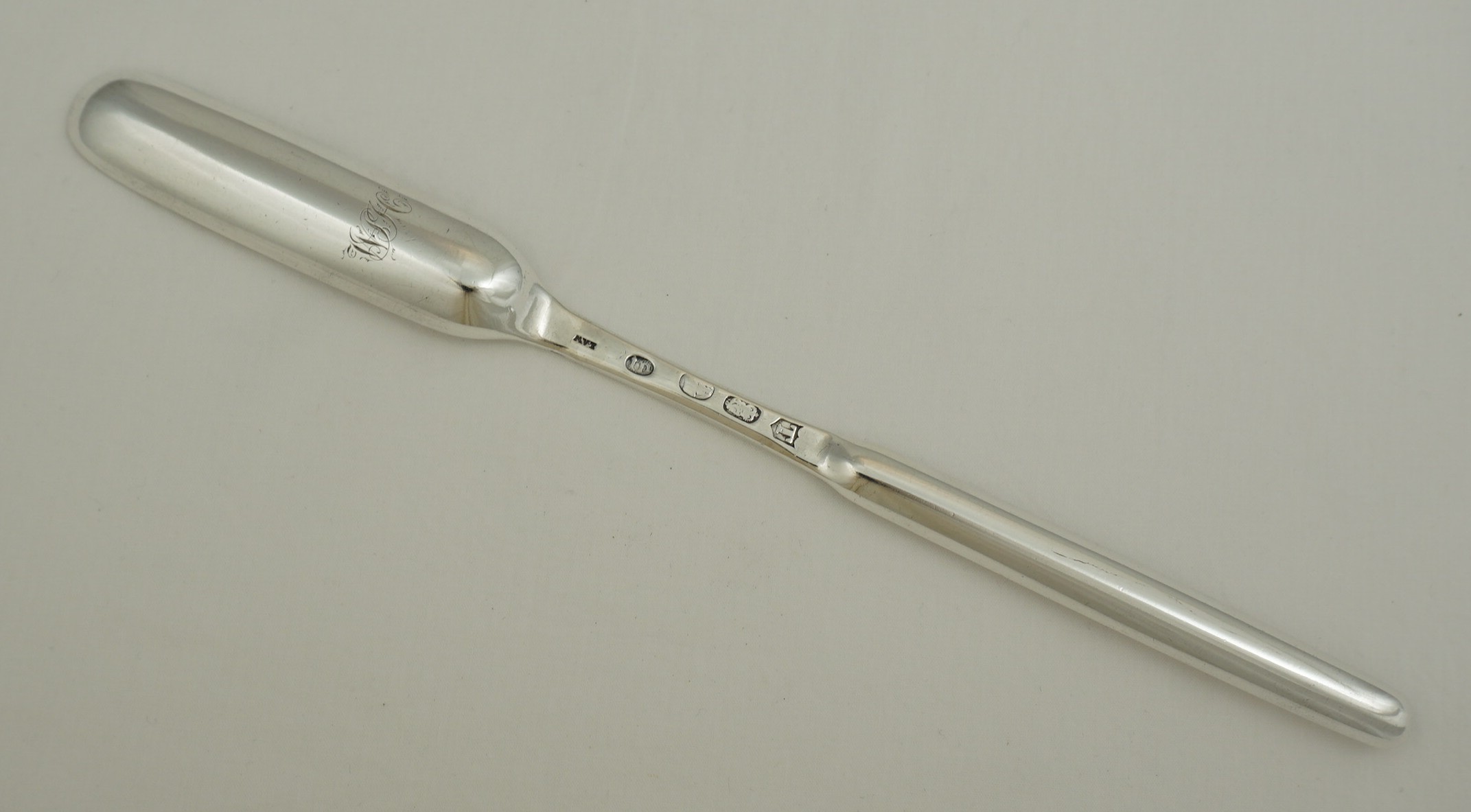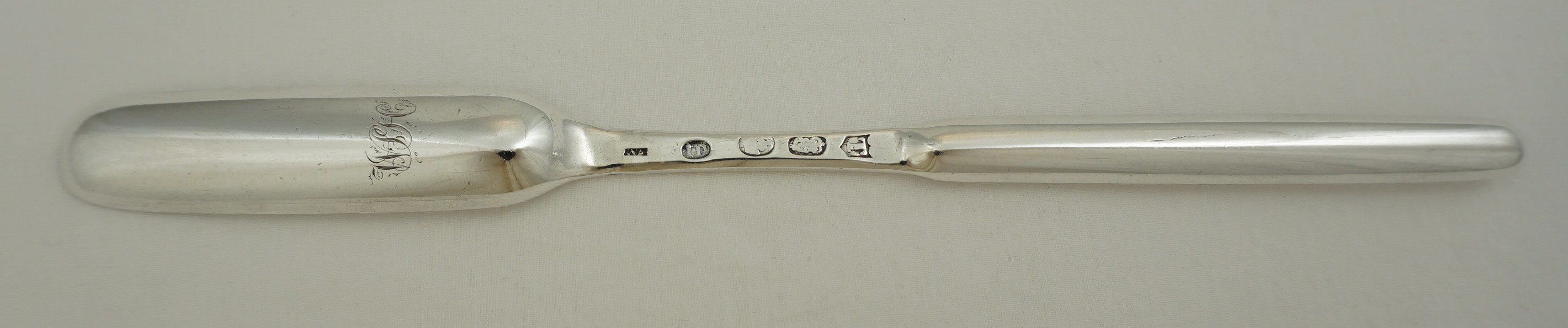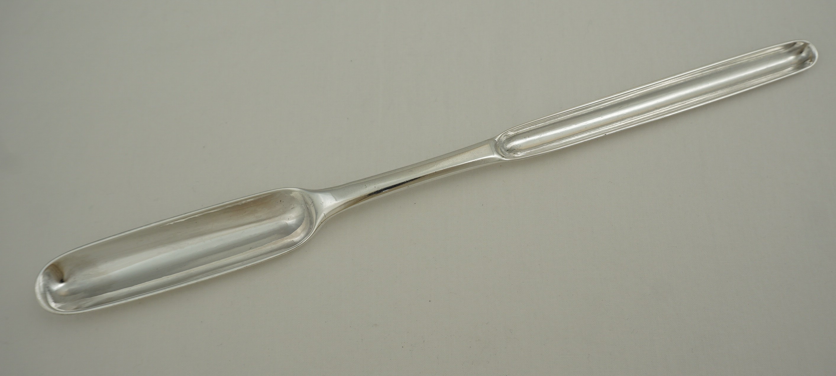 | DESCRIPTION | Exceptionally good antique Irish Georgian solid sterling silver marrow scoop with the original monogram engraving to the back of the beef bowl. Very good hallmarks and with the additional mark 'LAW' for William Law possibly acting as the retailer. |