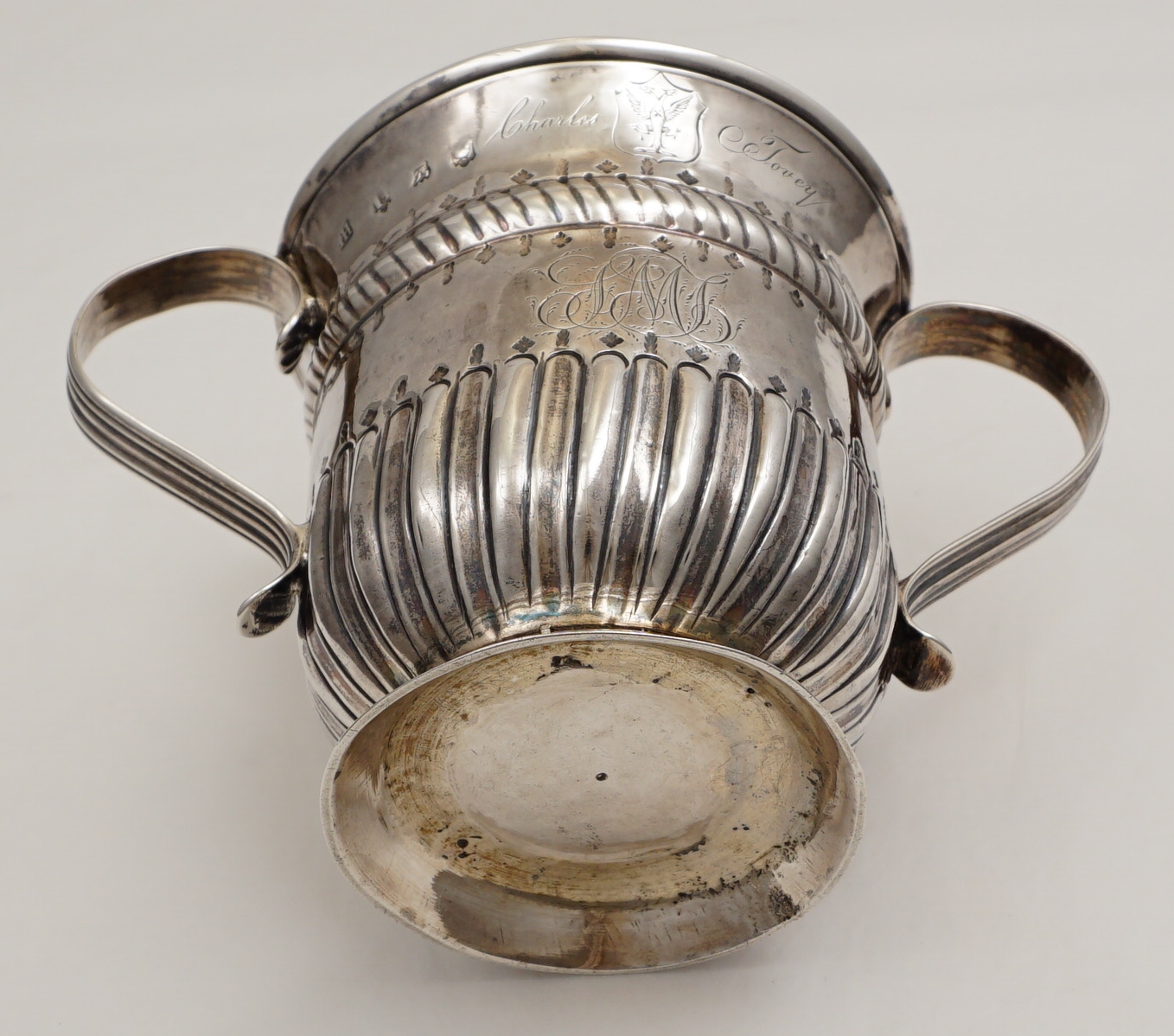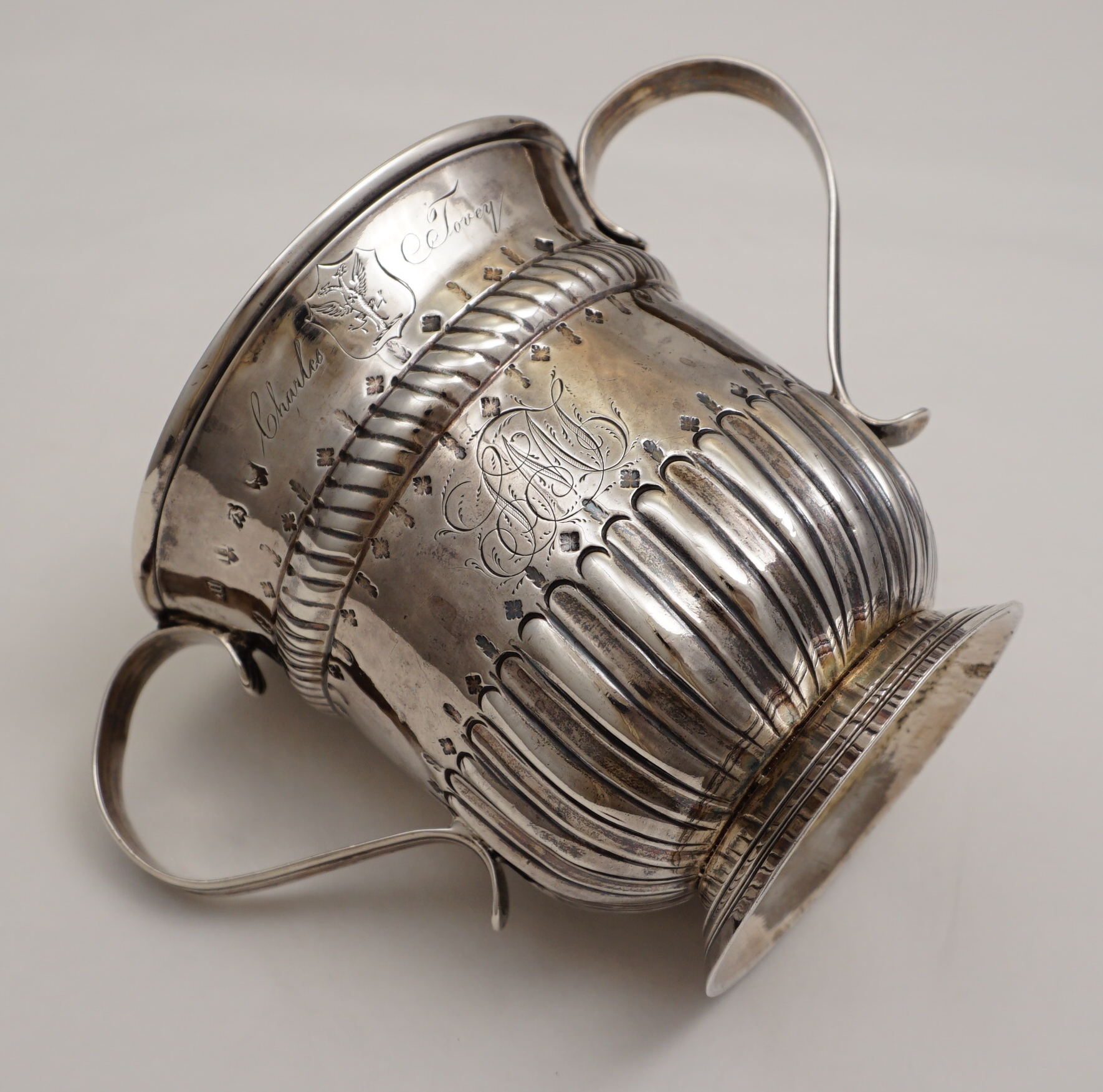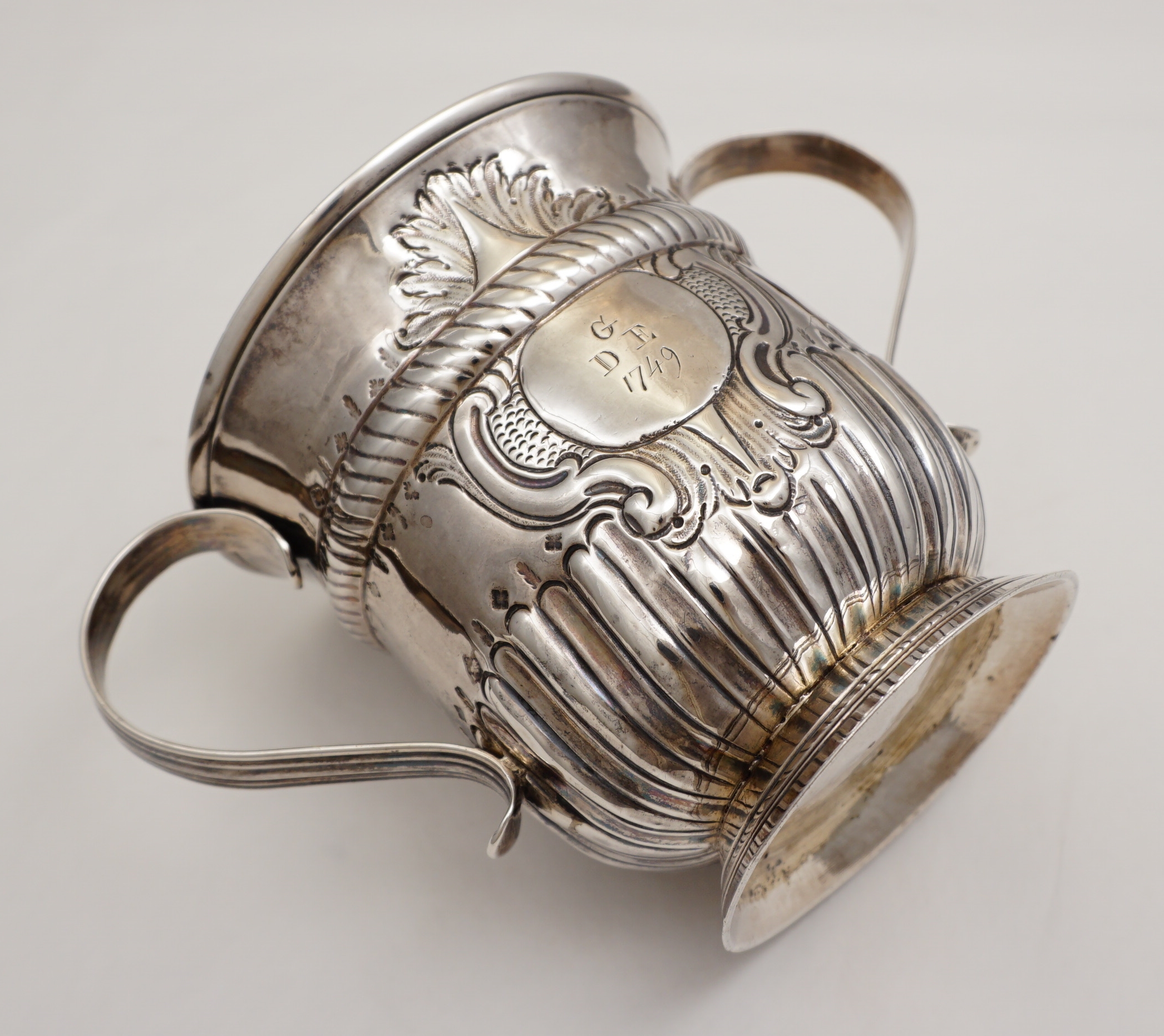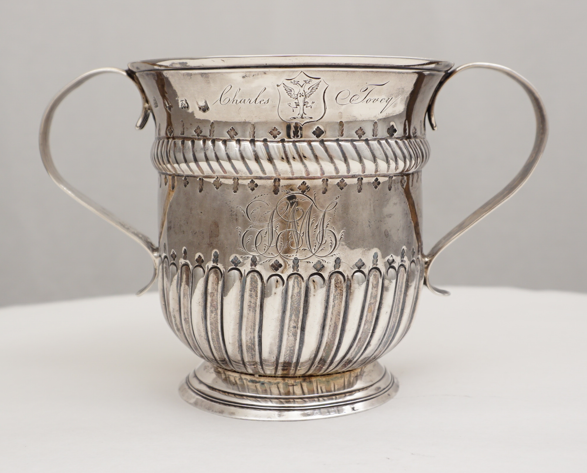 but 16th century inventories exist in which examples are described as 'cups with ears'. This pleases me. This large example is of standard form with a rope twist girdle above a lower band of fluting. Above and below the girdle and just above the fluting is engraved a band of alternating oak leaves and acorns. The cartouche is framed with chased scrolls and scale work and is engraved with an original betrothal engraving where "G" is the surname initial of the happy couple and "D" and "E" their first names and dated 1749. Verso is the next generation's monogram engraving of cursive script with multiple serifs typical of the latter part of the 18th century. Above this monogram is the name 'Charles Tovey' with a crest between that is probably 19th century. The hallmarks are good and clear for silver of this period with the maker striking his mark inverted. |