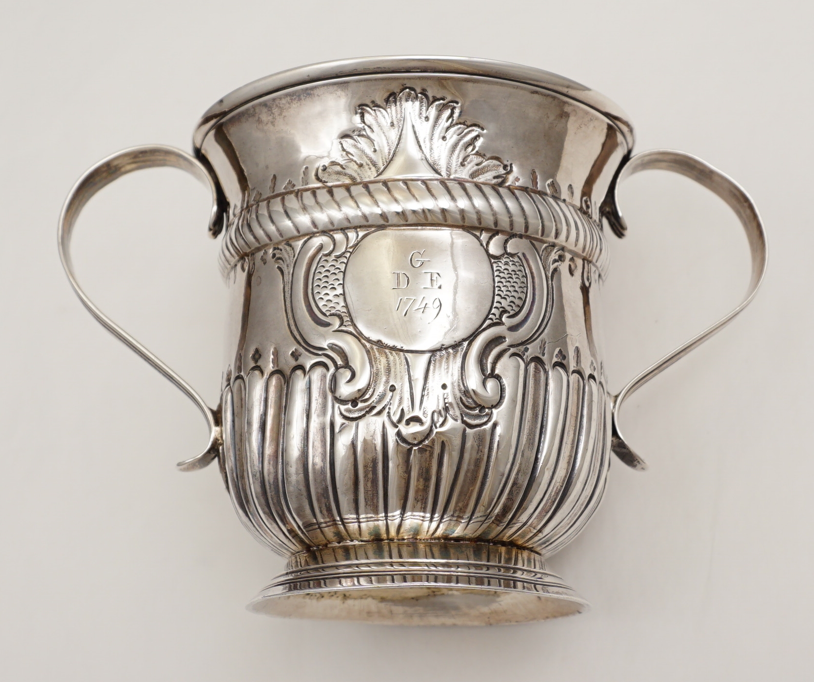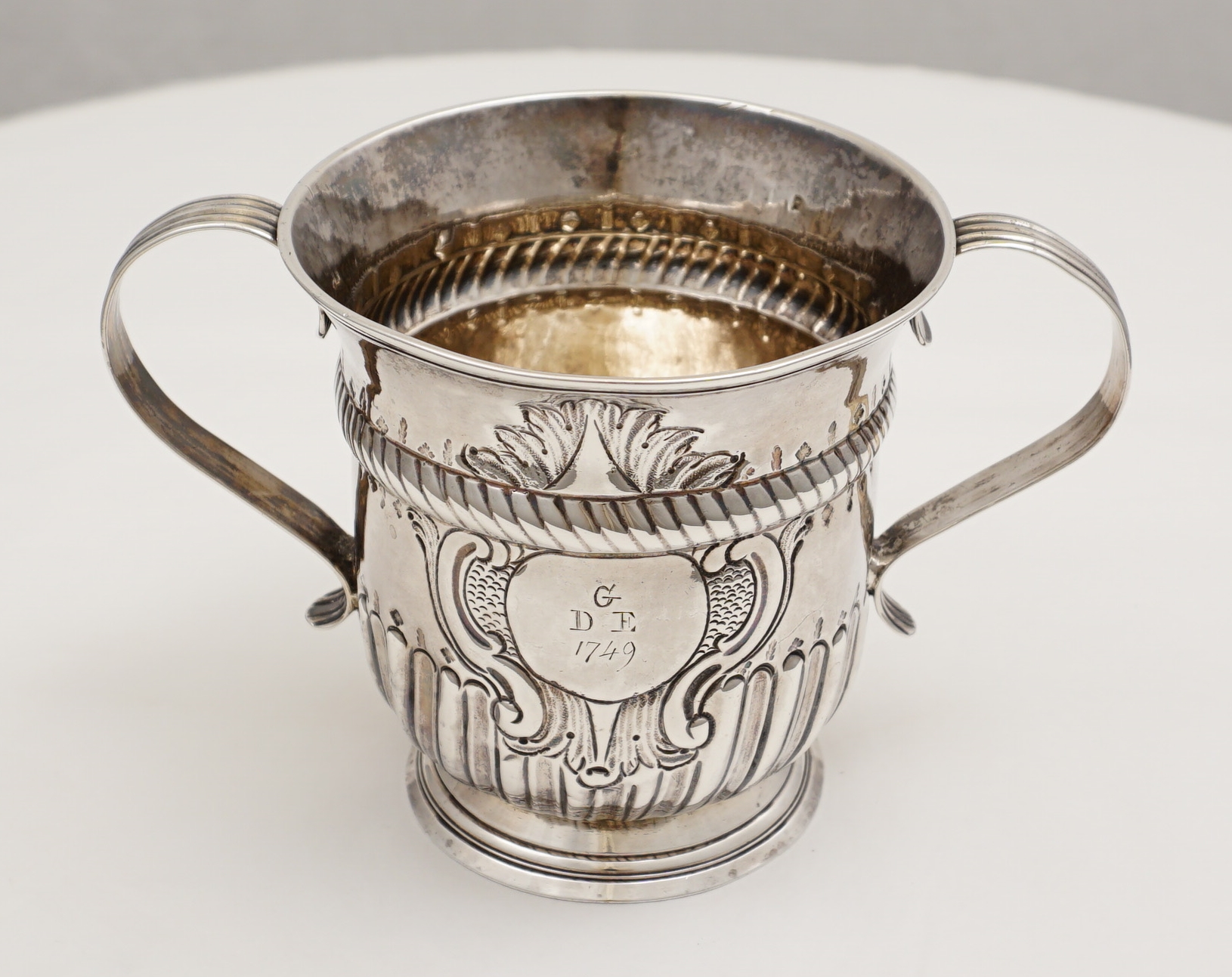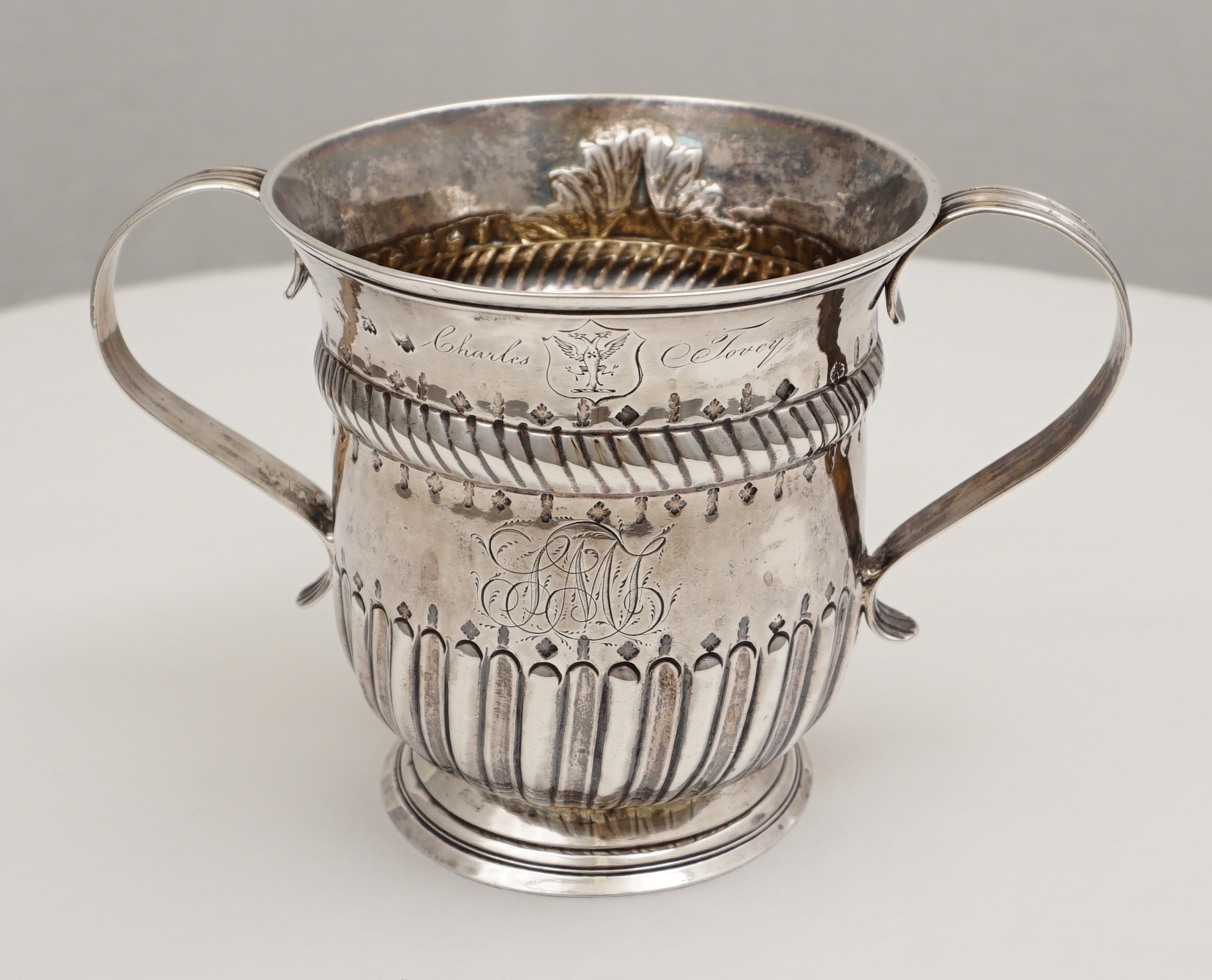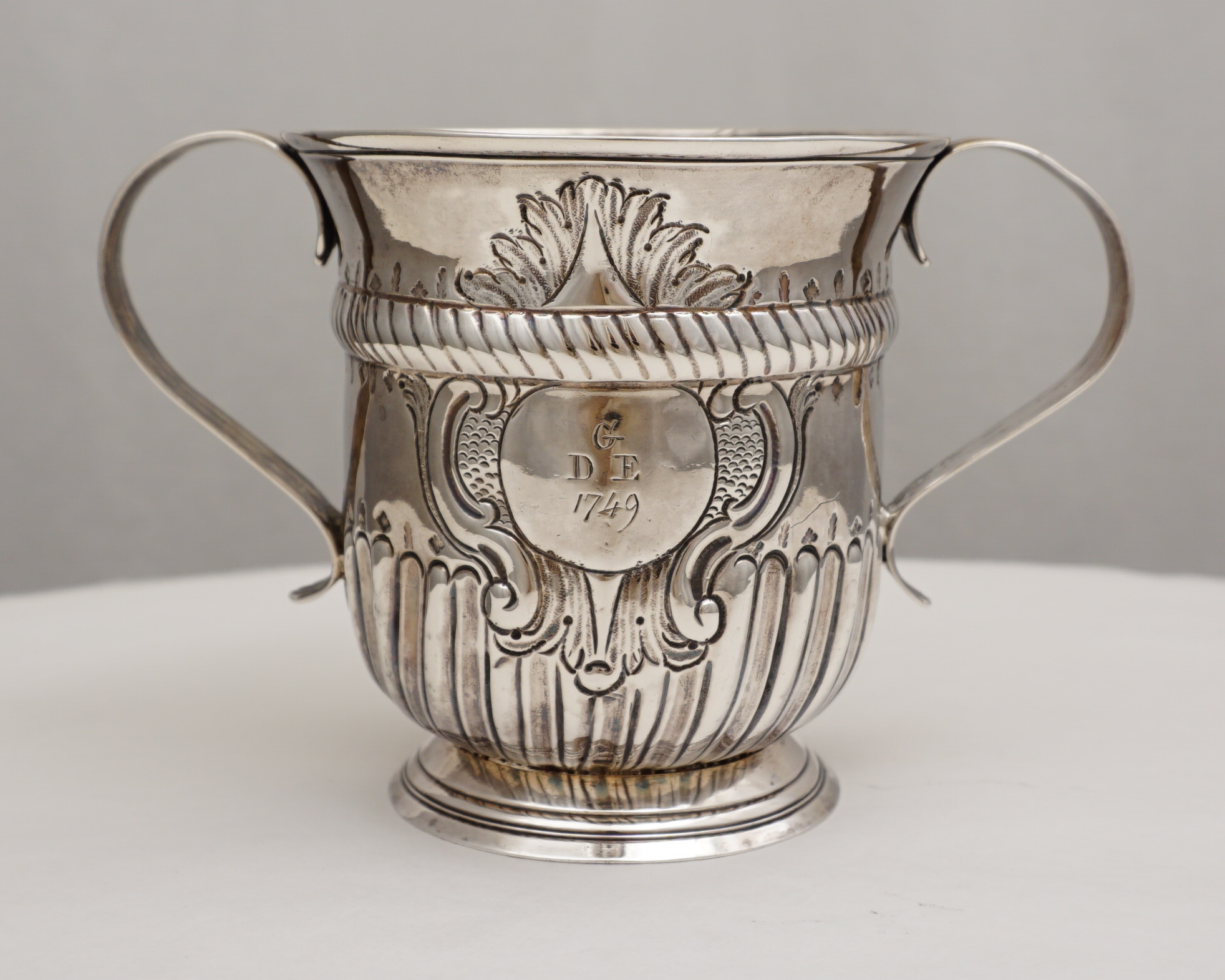 but 16th century inventories exist in which examples are described as 'cups with ears'. This pleases me. This large example is of standard form with a rope twist girdle above a lower band of fluting. Above and below the girdle and just above the fluting is engraved a band of alternating oak leaves and acorns. The cartouche is framed with chased scrolls and scale work and is engraved with an original betrothal engraving where "G" is the surname initial of the happy couple and "D" and "E" their first names and dated 1749. Verso is the next generation's monogram engraving of cursive script with multiple serifs typical of the latter part of the 18th century. Above this monogram is the name 'Charles Tovey' with a crest between that is probably 19th century. The hallmarks are good and clear for silver of this period with the maker striking his mark inverted. |