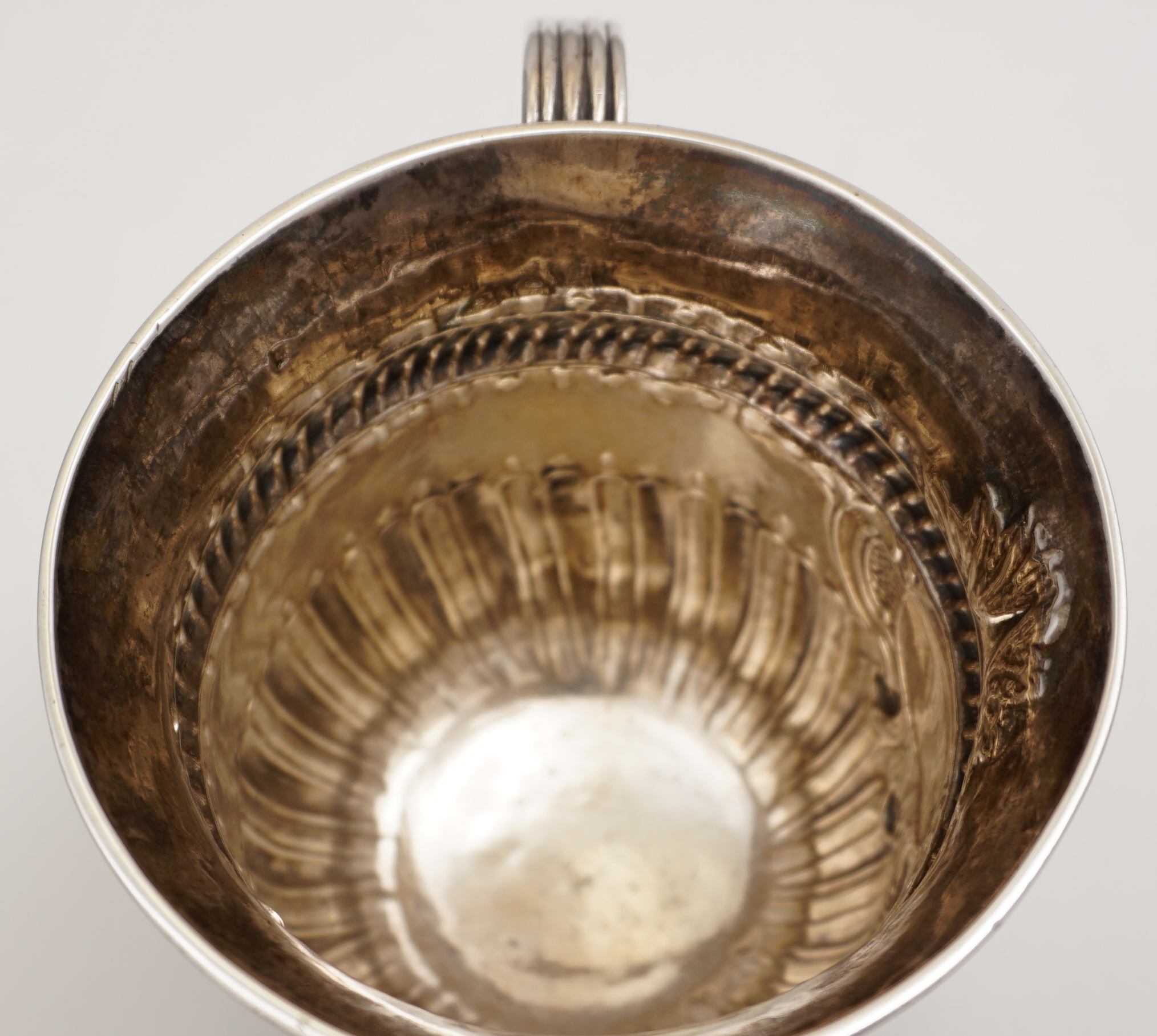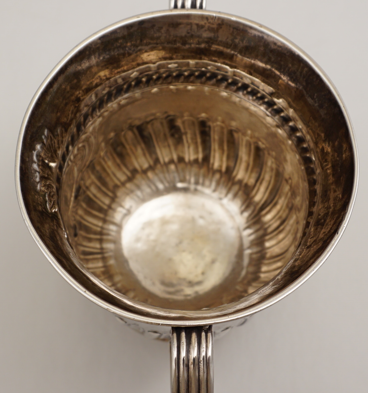 CONDITION | exceptionally good, thick silver, no erasures, both handles have received attention as I can see a little old solder within at both handles' bottom joints that would not have been there originally. I have tried to picture it but it is too small to show up well. The surface is pleasantly patinated in my opinion but it would polish up easily should you wish. |