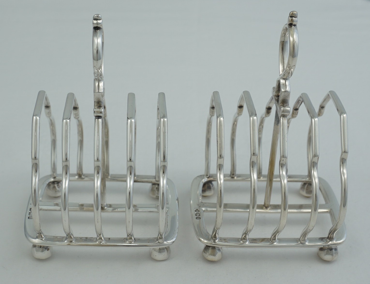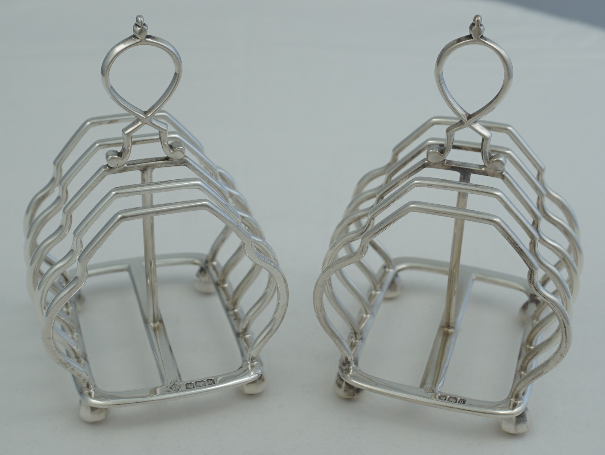 | DESCRIPTION | Pair of high quality antique English Victorian solid sterling silver 5-bar toast racks with central carrying handles. |